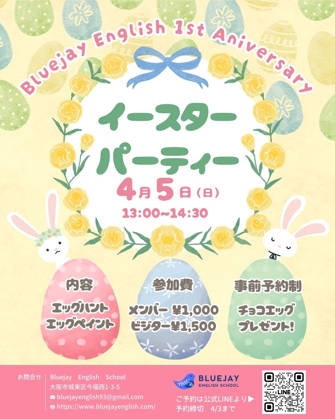 Bluejay English Schoolの1周年を記念して、イースターパーティーを行います!
